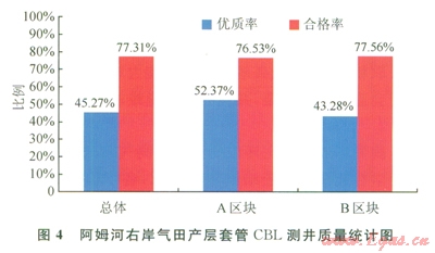 2008年川慶鉆探土庫(kù)曼分公司在阿姆河右岸應(yīng)用上述防氣竄固井技術(shù)先期進(jìn)行了6口井的先導(dǎo)性試驗(yàn),提高固井質(zhì)量效果明顯??偨Y(jié)應(yīng)用試驗(yàn)結(jié)果后,中國(guó)石油川慶鉆探工程公司井下作業(yè)公司對(duì)固井技術(shù)做了進(jìn)一步優(yōu)化,截止到2011年l2月,在39口井中應(yīng)用情況良好,CBL測(cè)井質(zhì)量?jī)?yōu)質(zhì)率達(dá)到45.27%(圖4),合格率達(dá)到77.31%,目前該區(qū)塊環(huán)空帶壓情況由2008年之前的40%下降到目前的6%。
