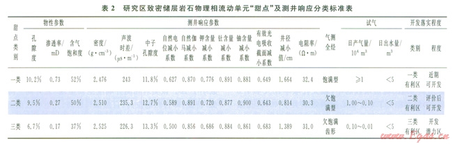 巖石物理相流動(dòng)單元“甜點(diǎn)”研究在致密儲(chǔ)層開(kāi)發(fā)中具有十分重要意義,一般致密氣層、差氣層主要富集于一、二類流動(dòng)單元內(nèi),氣顯示層則賦存于分隔體中。研究分隔屏障的主要問(wèn)題是要在剖面上將其劃分出來(lái),即對(duì)相應(yīng)儲(chǔ)集體進(jìn)行細(xì)分巖石物理相流動(dòng)單元,并盡可能描述出最小一級(jí)分隔體。為此,在該區(qū)致密儲(chǔ)層含氣有利區(qū)分布及非均質(zhì)特征研究中,精細(xì)地表征儲(chǔ)層性質(zhì)、分布及其對(duì)天然氣滲流的影響,結(jié)合巖石物理相流動(dòng)單元“甜點(diǎn)”儲(chǔ)層特征與測(cè)井響應(yīng)(含氣測(cè)全烴)特征,把該區(qū)巖石物理相流動(dòng)單元“甜點(diǎn)”劃分為一、二、三類,即按滲流、儲(chǔ)集和含氣“甜點(diǎn)”控制能力及測(cè)井響應(yīng)特征分為近期可開(kāi)發(fā)(一類)、評(píng)價(jià)后可開(kāi)發(fā)(二類)及勘探開(kāi)發(fā)潛力區(qū)(三類)等三類含氣有利區(qū)(表2)。