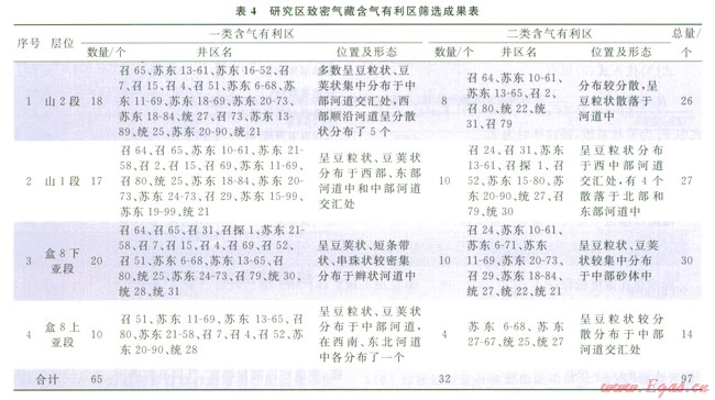 通過(guò)上述山2段、山1段、盒8下亞段、盒8上亞段主要含氣目的層段含氣有利區(qū)分析預(yù)測(cè),分別層位篩選并劃分出一類、二類含氣有利區(qū)氣藏97個(gè),其中在山2段篩選圈定26個(gè),山1段圈定27個(gè),盒8下亞段圈定30個(gè),盒8上亞段圈定14個(gè)(表4)。這些含氣有利區(qū)處于十分有利的沉積成巖儲(chǔ)集相帶及其含氣圈閉和含氣富集條件下,測(cè)井解釋具有明顯較好的儲(chǔ)集、滲流和含氣特征,測(cè)井綜合評(píng)價(jià)為一、二類巖石物理相流動(dòng)單元“甜點(diǎn)”,試氣具有工業(yè)氣流或較高產(chǎn)量,為該區(qū)致密氣藏儲(chǔ)層增儲(chǔ)上產(chǎn)提供有利目標(biāo)和井區(qū)(圖1、2)。
