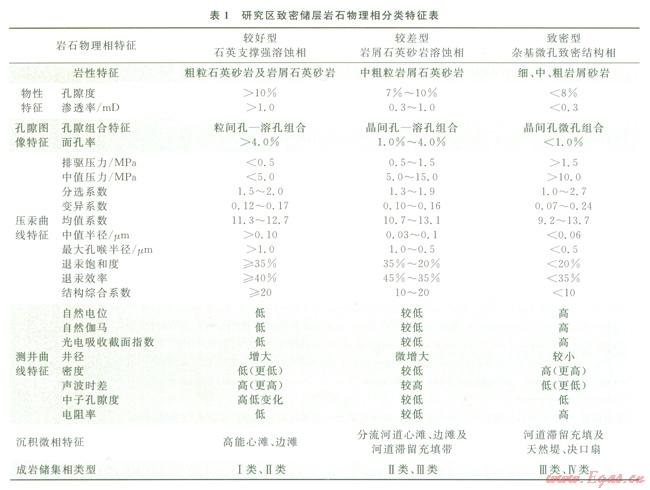 分析該區(qū)致密儲(chǔ)層巖石物理相和測(cè)井響應(yīng)特征的結(jié)果表明,巖石物理相分類集中體現(xiàn)m儲(chǔ)層巖性、物性、孔隙類型、孔隙結(jié)構(gòu)和測(cè)井響應(yīng)對(duì)儲(chǔ)層巖石物理相的控制作用,巖石物理相分類的測(cè)井儲(chǔ)層參數(shù)模式則主要是通過(guò)規(guī)則化處理孔隙流體影響。岡此,儲(chǔ)層巖石物理相是控制致密儲(chǔ)層“四性”關(guān)系和測(cè)井響應(yīng)特征的主導(dǎo)因素[6-8]。特別在其普遍存在早一中成巖期強(qiáng)烈的壓實(shí)壓溶及膠結(jié)作用,使得致密儲(chǔ)層原生孔隙損耗嚴(yán)重,大大改變了儲(chǔ)層原始孔隙結(jié)構(gòu),形成了以成巖溶孔為主、多孔隙類型共存的混合型致密氣儲(chǔ)集特征。儲(chǔ)層中大部分孔隙被限制性喉道所控制,造成儲(chǔ)層退汞效率低,難采體積大。為此,依據(jù)上述致密儲(chǔ)層巖石物理相形成的地質(zhì)條件,分析該區(qū)目的層段致密儲(chǔ)層沉積、成巖作用和巖性、物性、孔隙類型、孔隙結(jié)構(gòu)及測(cè)井響應(yīng)特征,在研究區(qū)劃分出較好型、較差型、致密型的一、二、三類巖石物理相類型[9-11](表1)。