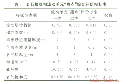 表3中一、二、三類巖石物理相流動(dòng)單元“甜點(diǎn)”明顯反映致密氣藏儲(chǔ)層巖性、物性、含氣性及流動(dòng)層帶參數(shù)分布特征差異,其評(píng)價(jià)參數(shù)標(biāo)準(zhǔn)與該區(qū)巖石物理相分類特征及含氣有利區(qū)分類標(biāo)準(zhǔn)相吻合。