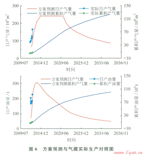 將相態(tài)恢復(fù)研究成果運(yùn)用于氣藏模擬和方案預(yù)測(cè)中,氣井的產(chǎn)氣量、產(chǎn)油量、井l:3壓力等關(guān)鍵生產(chǎn)指標(biāo)能夠得到較好擬合,在此基礎(chǔ)上建立氣藏預(yù)測(cè)模型預(yù)測(cè)氣藏產(chǎn)量,產(chǎn)氣量和產(chǎn)油量與實(shí)際吻合程度較高,油氣比基本吻合(圖6),高壓物性實(shí)驗(yàn)、常規(guī)凝析氣藏類型判別與生產(chǎn)靜動(dòng)態(tài)特征相結(jié)合的氣藏類型判別方法和相態(tài)恢復(fù)理論確定的氣藏類型是正確的、預(yù)測(cè)的凝析油含量是可靠的。