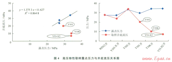 飽和凝析氣藏在分離器取樣進(jìn)行PVT實(shí)驗(yàn),由于部分重質(zhì)組分的丟失,通常表現(xiàn)出露點(diǎn)壓力與井底流壓呈線性關(guān)系。安岳地區(qū)須二段氣藏的WDl2、X12、Yl03井取樣壓力與實(shí)測(cè)露點(diǎn)壓力呈線性關(guān)系,且擬合相關(guān)性較好,R2=0.8648;而Yl01、Yl06和Y53-X2井則表現(xiàn)出過剩油的特征(圖4)。因此,該氣藏為飽和凝析氣藏是可以肯定的,是否就像傳統(tǒng)方法判斷的那樣具有“油環(huán)”,還需進(jìn)一步論證。