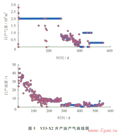 選取產(chǎn)油量最高的Y53-X2氣井進(jìn)行分析,該井投產(chǎn)第一個(gè)月,平均日產(chǎn)氣2.04×104 m3,平均日產(chǎn)油35.27t,油氣比達(dá)到l7.29t/104m3,產(chǎn)出油密度0.8055g/cm3,含蠟量l3.63%,屬于原油。在實(shí)驗(yàn)室測(cè)得Y53-X2井原始地層條件下飽和油的氣油比為216.49m3/m3,飽和凝析氣氣油比為4883.75 m3/m3,結(jié)合實(shí)際生產(chǎn)過程中產(chǎn)出流體的油氣比,計(jì)算該井不同時(shí)間產(chǎn)出天然氣與產(chǎn)出原油在地下的體積比(表4),結(jié)果表明產(chǎn)出流體中原油的比例迅速降低,表現(xiàn)為局部聚集原油的特征。Y53-X2井采氣曲線也表明隨著生產(chǎn)的進(jìn)行,產(chǎn)出原油迅速下降,該井投產(chǎn)279d后,氣產(chǎn)量基本保持2×104m3/d,油產(chǎn)鰱從初期的45t/d降至2.0t/d(圖5),油產(chǎn)量及油氣比迅速下降,同樣說明井底附近原油有限。