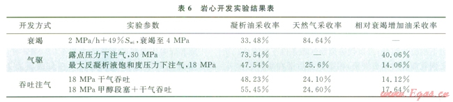 凝析氣藏通常的開采方式主要有衰竭式開采、循環(huán)注氣(露點(diǎn)壓力以上注氣和露點(diǎn)壓力注氣)以及單井吞吐[8-10]。實(shí)驗(yàn)及理論研究證明多孔介質(zhì)中凝析油的采收率高于PVT筒高壓物性實(shí)驗(yàn)[11-13]。因此采用室內(nèi)巖心物理模擬實(shí)驗(yàn)優(yōu)選合理開發(fā)方式,結(jié)果表明在氣藏平均束縛水飽和度為49%,廢棄壓力為4MPa條件下,采用衰竭式開發(fā),凝析油采收率能夠達(dá)到33.48%,天然氣采收率為84.64%,在露點(diǎn)壓力以上注氣,能夠提高凝析油采收率40.06%,在反凝析液飽和度最大壓力下注氣,能夠提高凝析油采收率l4.06%,單井干氣吞吐和加甲醇段塞的單井干氣吞吐,分別提高凝析油采收率14.12%和l7.64%(表6)??紤]安岳地區(qū)須二段氣藏為低孔、低滲的砂巖氣藏,非均質(zhì)性強(qiáng),不建議采用循環(huán)注氣的開采方式,另外加甲醇段塞雖然能夠解除水鎖,降低氣液的界面張力,提高氣相相對(duì)滲透率[14],但是考慮到注入成本以及后期的處理,建議單井采用先衰竭后干氣吞吐的開采方式,可提高凝析油采收率,達(dá)到效益開發(fā)的目的。