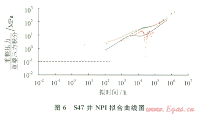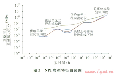 此外,S47井典型曲線分析也表明(圖4),該裂縫系統(tǒng)存在多個(gè)儲(chǔ)集體,不同連通范圍在NPI曲線上均有特征反映,且明顯可以發(fā)現(xiàn)由于地層水侵影響,造成NPI導(dǎo)數(shù)曲線異常下掉,與前面理論研究認(rèn)識(shí)一致。