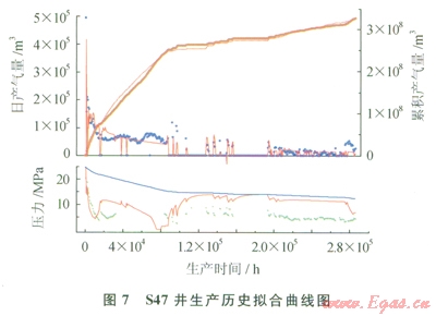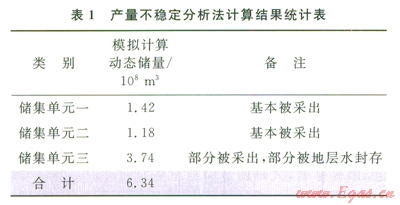 通過(guò)前面典型曲線和生產(chǎn)歷史擬合分析,最終確定S47井裂縫系統(tǒng)動(dòng)態(tài)儲(chǔ)量為6.34×l08m3;(表1)。在儲(chǔ)量模擬計(jì)算過(guò)程中,可以發(fā)現(xiàn)儲(chǔ)集單元一和儲(chǔ)集單元二的儲(chǔ)量基本被采出,而由于地層水侵的影響,儲(chǔ)集單元三僅部分儲(chǔ)量被采出,絕大部分儲(chǔ)量被地層水封存,是氣藏下一步進(jìn)行挖潛的主要目標(biāo)。