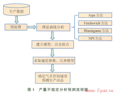 隨著氣井生產(chǎn)動(dòng)態(tài)分析技術(shù)的不斷發(fā)展,逐漸形成了以生產(chǎn)數(shù)據(jù)為分析對(duì)象,對(duì)氣井進(jìn)行生產(chǎn)分析、評(píng)價(jià)和預(yù)測(cè)的新方法,稱為產(chǎn)量不穩(wěn)定分析法。該方法以Arps產(chǎn)量遞減分析、Fekovich曲線擬合分析、Biasingame現(xiàn)代遞減分析、NPI重整壓力積分曲線分析為基礎(chǔ)[10-13],綜合考慮儲(chǔ)滲特征、流體物性等情況,開(kāi)展各種典型曲線、生產(chǎn)歷史曲線的擬合分析,不斷修正模型參數(shù),最終確定氣井生產(chǎn)動(dòng)態(tài)模型,實(shí)現(xiàn)動(dòng)態(tài)儲(chǔ)量計(jì)算和生產(chǎn)分析預(yù)測(cè),分析流程如圖1所示。