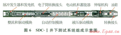 中國(guó)石油大慶鉆探工程公司鉆井T程技術(shù)研究院于2009年5月研制完成了SDC-I型隨鉆地層壓力測(cè)試器[16],并進(jìn)行了6口井的現(xiàn)場(chǎng)試驗(yàn),收到了較好的效果。該測(cè)試器分為井下測(cè)試系統(tǒng)、地面信息接收及處理系統(tǒng)兩部分。井下測(cè)試系統(tǒng)(圖6)負(fù)責(zé)完成地層壓力的測(cè)試并存儲(chǔ)和上傳數(shù)據(jù),地面信息接收及處理系統(tǒng)負(fù)責(zé)對(duì)數(shù)據(jù)進(jìn)行接收和處理?,F(xiàn)場(chǎng)試驗(yàn)表明,該測(cè)試器設(shè)計(jì)合理,可靠性高,壓力測(cè)量精度達(dá)到0.1%,溫度測(cè)量精度達(dá)到±0.5℃,井下供電功率達(dá)到l60W??呻S鉆實(shí)現(xiàn)數(shù)據(jù)上傳和井下存儲(chǔ)功能,地面可隨鉆獲取井下準(zhǔn)確的環(huán)空壓力、溫度、地層壓力和地層流度(地層流度表示流體在該地層中流動(dòng)的難易程度。是油層有效滲透率與流體黏度的比值)。經(jīng)過(guò)一年半的推廣,SDC-I目前共完成12口井的現(xiàn)場(chǎng)測(cè)試工作,井下測(cè)試最高壓力47.02MPa,最高溫度109.7℃。這種測(cè)試器已初步具備商業(yè)化應(yīng)用的條件[17]。