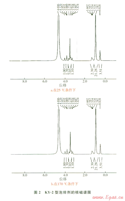 對比紅外和核磁譜圖,泡排劑老化前后的譜圖基本一致,證實分子鏈上的官能團數(shù)量、性質以及位置沒有發(fā)生變化,進一步證明了該泡排劑的性能在老化前后基本保持一致。綜合研究表明,KY-2型泡排劑具有良好的耐溫性能,在深井高溫條件下具有良好的起泡、穩(wěn)泡和帶水能力,在有水氣藏排水采氣作業(yè)中具有良好的應用前景。