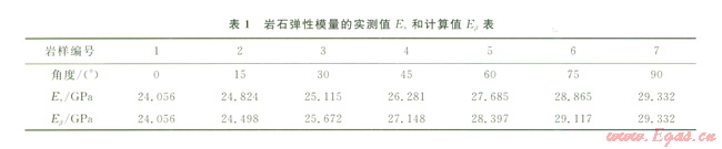 從表2可以看出,計(jì)算的彈性模量與實(shí)測值接近,最大誤差為3%。因此,只要對(duì)巖石作平行和垂直層理以及45°方向的3組樣品單軸壓縮實(shí)驗(yàn),就可用計(jì)算值來代替樣品的實(shí)測值,而不需要對(duì)每一個(gè)方向(β角)的樣品進(jìn)行單軸壓縮實(shí)驗(yàn)來確定模量,可省去大量樣品加工及實(shí)驗(yàn)工作。結(jié)果表明將層理巖石視為橫觀各向同性介質(zhì)來計(jì)算彈性模量是可行的。