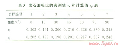 由表1的數(shù)據(jù)通過(12)計(jì)算泊松比隨角β的變化規(guī)律,泊松比的實(shí)測值和計(jì)算值結(jié)果數(shù)據(jù)見表3。