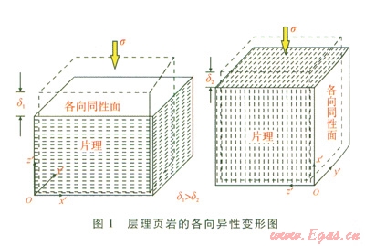 層理頁巖的各向異性變動(dòng)如圖l所示,垂直構(gòu)造面的壓縮性顯著大于平行構(gòu)造面的壓縮性,所以,這種巖石在層理面的應(yīng)力-應(yīng)變性狀是各向同性的。