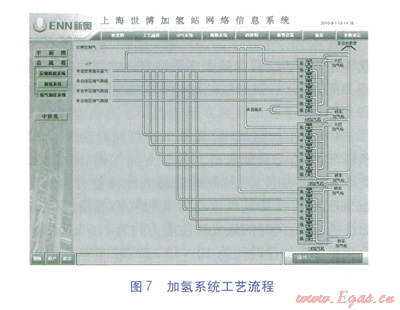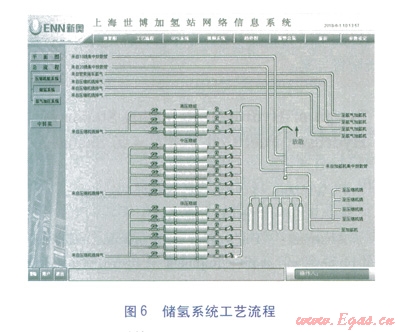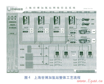 上海世博會(huì)專用燃料電池加氫站根據(jù)上述因素,加氫系統(tǒng)工藝流程見圖7。加氫機(jī)先從管束(0級(jí)瓶組)取氣,當(dāng)管束內(nèi)的氫氣壓力與汽車上的車載儲(chǔ)氣瓶壓力平衡時(shí),停止從管束取氣;切換至低壓瓶組,開始從低壓儲(chǔ)氣瓶組取氣,低壓瓶組內(nèi)壓力與車載儲(chǔ)氣瓶?jī)?nèi)壓力平衡時(shí),停止取氣;切換至中壓瓶組,開始從中壓儲(chǔ)氣瓶組取氣,中壓瓶組內(nèi)壓力與車載氣瓶?jī)?nèi)壓力平衡時(shí),停止取氣;切換至高壓瓶組,開始從高壓儲(chǔ)氣瓶組取氣,高壓瓶組內(nèi)壓力與車載氣瓶?jī)?nèi)壓力平衡時(shí),停止取氣;如果還有車輛需要加氣,開啟壓縮機(jī),壓縮機(jī)從管束內(nèi)取氣,進(jìn)行增壓后,直接給加氫機(jī)供氣,直至汽車加滿氫氣,經(jīng)壓縮機(jī)增壓的氫氣按高、中、低壓瓶組順序向各儲(chǔ)氣瓶組充氣。