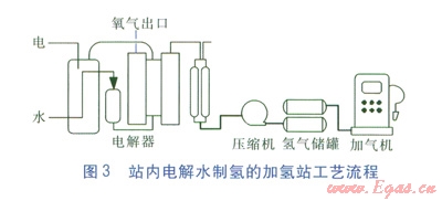 站內(nèi)制氫是指氫氣在加氫站內(nèi)現(xiàn)場(chǎng)制取,目前站內(nèi)制氫的技術(shù)路線主要是化石燃料(天然氣、甲醇等)重整制氫和電解水制氫。電解水制氫(見圖3)是在一些電解質(zhì)水溶液中通入直流電,利用電解器將水電解成氫氣和氧氣。氫氣經(jīng)壓縮機(jī)增壓后進(jìn)入儲(chǔ)罐內(nèi)儲(chǔ)存,加氫時(shí),加氣機(jī)從儲(chǔ)罐內(nèi)取氣。