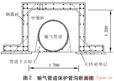A號路為城市快速路,建設(shè)標(biāo)準(zhǔn)高,路面結(jié)構(gòu)厚度約80cm,路基需要分層碾壓以滿足道路密實度要求??紤]到輸氣管道設(shè)計壓力高,環(huán)向應(yīng)力大,為保證管道在道路施工及今后運行中的安全,我們對A號路車行道下的輸氣管道采用管溝保護(hù)(見圖2,圖中尺寸單位為mm,以下同)。管溝內(nèi)壁與輸氣管道之間凈距不小于50cm,采用現(xiàn)澆施工,兩端伸出道路邊緣2m,并要求施工中盡量保留輸氣管道周圍的原土,避免破壞管道防腐層。