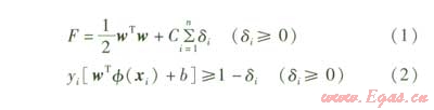 優(yōu)化的目標(biāo)函數(shù)為F=wTw,目標(biāo)函數(shù)F可以保證分類的最優(yōu)性,約束條件(式2)則保證分類的正確性。為了消除異常樣本的影響,引入松弛變量δi,相應(yīng)的目標(biāo)函數(shù)可以表示為: