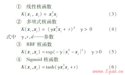 在SVM中最常用的幾種核函數(shù)見式(3)~(6),其中線性核函數(shù)可以看作是多項(xiàng)式核函數(shù)的一種特殊情況。