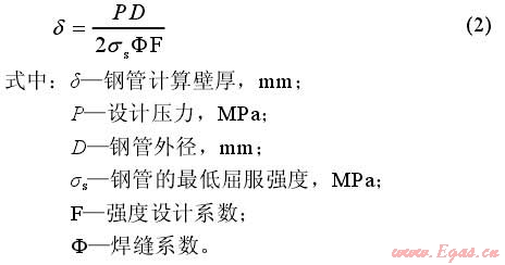 管道壁厚選取不僅要求滿足管道強度、穩(wěn)定性要求,同時應滿足抗御外力破壞的要求。按照《城鎮(zhèn)燃氣設計規(guī)范》(GB50028—2006)的相關要求,直管段管壁厚度按公式(2)計算: