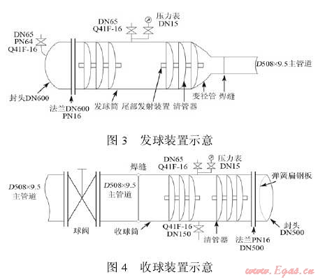 管道清掃干凈后進行注水試壓,水壓試壓每段不宜超過35km,高差不宜超過30m,管道試壓注水時,宜加隔離球,且應保持一定的球前壓力,以排除管內空氣,試壓合格后排盡試壓水并對管道進行干燥,直至管內空氣水露點比輸送條件下最低環(huán)境溫度低5℃,若管道封閉超過3個月未投產,應對管道進行充氮氣保護。下面以主管道D508×9.5為例,其發(fā)球裝置和收球裝置示意圖如下:
