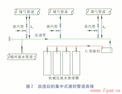 層為焦油,下層為焦油渣,沉淀在槽底的焦油渣由刮板輸送機(jī)排出槽外,焦油則通過(guò)液面調(diào)節(jié)器流至焦油槽,澄清后的氨水經(jīng)上部溢流至循環(huán)氨水槽,送往后續(xù)工段使用。改造后的集中式液封管道連接見圖2。