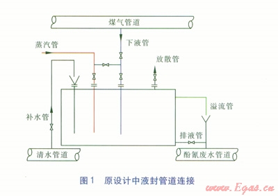 按原設(shè)計(jì),煤氣輸送主管道上的附屬液封一期有6個(gè)(其余液封為設(shè)備專用液封)、二期有8個(gè)(其余液封為設(shè)備專用液封);每個(gè)液封都設(shè)有放散管、下液管、溢流管、排液管及蒸汽管等附屬管道,所有下液最后經(jīng)溢流管流至酚氰廢水管道匯合至污水處理站。原設(shè)計(jì)中液封管道連接見圖l。