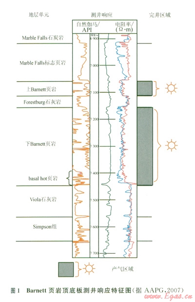 基于技術(shù)和成本方面的考慮,國外對頂、底板的研究歷來比較重視[4-5]。北美一些主要的頁巖氣盆地大都具有“三明治”式的展布特征。以美國福特沃斯盆地著名的Barnett頁巖為例,上Barnett頁巖以Marble Falls石灰?guī)r為頂板,Forestburg石灰?guī)r作為底板,圖1顯示,頂?shù)装逄帨y井響應(yīng)特征為低自然伽馬值、高電阻率;而上Barnett頁巖段則顯示為高伽馬值、低電阻率的特征,可以明顯區(qū)分。下Barnett頁巖則是以Forestburg石灰?guī)r和Viola石灰?guī)r分別作為頂、底板,相應(yīng)的頁巖氣藏也位于頂、底板之間的含氣泥頁巖層段內(nèi),封閉性較好。頂、底板封閉的含氣泥頁巖段為主力產(chǎn)氣層[6]。