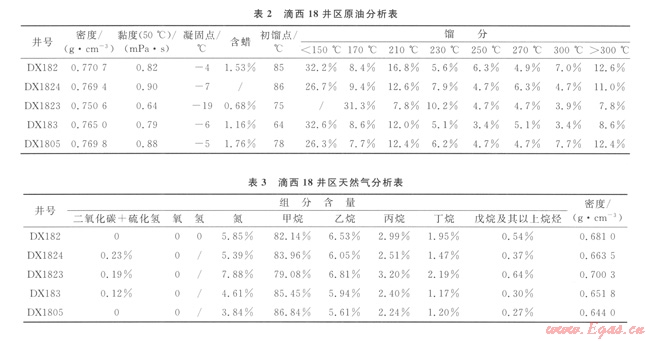 DX183與DX1805井的原油分析表可看出二者在黏度、含蠟量、初餾點、不同溫度下餾分百分比等方面差別都較大,這兩口井在天然氣密度、甲烷、氮氣、二氧化碳這幾個組分的含量上也有較大差異(表2、3),因此,二者所產(chǎn)氣性質(zhì)差別較大,不是同一氣藏,所以DXl83井與DX1805井試采段應(yīng)不連通。