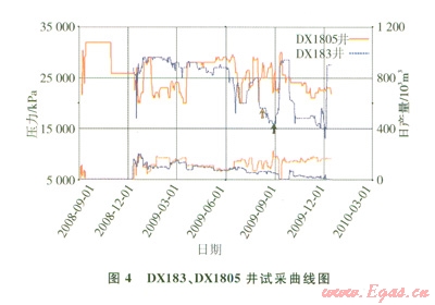 DX 183與DX1805井投產(chǎn)時間接近,但兩口井壓力下降的趨勢卻具有明顯的差別,不具有同步下降的特征(圖4);2009年9月,全氣田關(guān)井后,兩井壓力恢復(fù)值差別較大,應(yīng)不屬于同一壓力系統(tǒng)。
