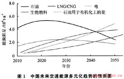 圖1是中國(guó)未來(lái)交通能源多元化趨勢(shì)的預(yù)測(cè)圖[1]。