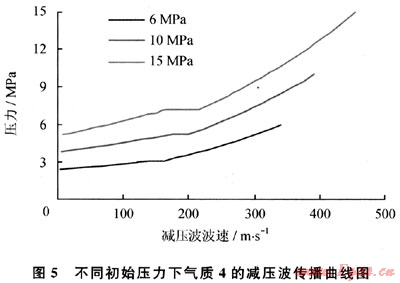 為了研究初始?jí)毫p壓波特性的影響,以表2中氣質(zhì)4為例,保持初始溫度30℃不變,采用Decomwave軟件對不同初始?jí)毫?6MPa、10MPa、15MPa)的減壓波波速進(jìn)行計(jì)算,結(jié)果如圖5所示。