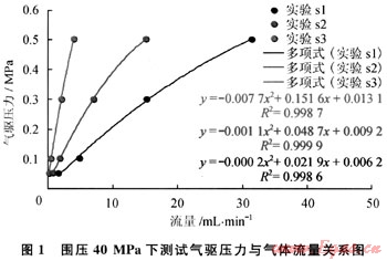 第二步:連接氣源,采用調(diào)壓閥設(shè)置氣驅(qū)壓力從低壓(0.05MPa)開(kāi)始逐級(jí)增壓(0.1MPa,0.2MPa,0.3MPa,0.4MPa,0.5MPa,0.6MPa,…,5.0MPa)進(jìn)行氣驅(qū),每個(gè)壓力點(diǎn)氣驅(qū)時(shí)間在1.0h以上直至氣流量穩(wěn)定,采用皂沫流量計(jì)或者高精度電子流量計(jì)測(cè)試氣體流量,高精度壓力傳感器記錄壓力。