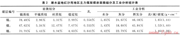紅沙崗地區(qū)煤層以光亮、半亮型煤為主,鏡煤、亮煤、暗煤常互層出現(xiàn)[5];煤巖顯微組分以鏡質(zhì)組為主(表2),一般超過(guò)80%,惰性組很少,殼質(zhì)組含量較高,為3%~8%,對(duì)煤層氣的生成有利。