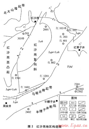 紅沙崗呈北東翹起向南西傾伏的寬緩復(fù)式向斜構(gòu)造[4],軸向北東東(約73°),軸長(zhǎng)大于5km;西北翼平緩,傾角10°~20°;東南翼較陡,傾角一般超過(guò)25°,北部最陡處可超過(guò)55°,次級(jí)褶皺、斷裂發(fā)育。