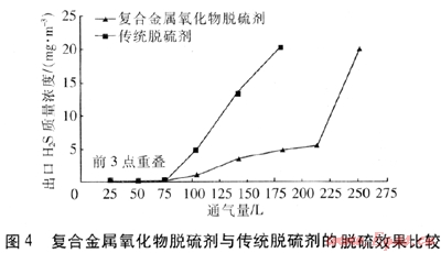將改進(jìn)后的脫硫劑與傳統(tǒng)工藝生產(chǎn)的脫硫劑在同樣的實(shí)驗(yàn)條件下,進(jìn)行了比較,結(jié)果見圖4。實(shí)驗(yàn)條件為:反應(yīng)器直徑為8mm,長(zhǎng)度為33cm,脫硫劑粒度為420~840μm目,裝填質(zhì)量為5g,流速為1.0L/min,空間速度為9000h一左右;試驗(yàn)氣體為硫化氫和氮?dú)獾幕旌蠚怏w;進(jìn)口硫化氫質(zhì)量濃度為1.0g/m3,硫容穿透標(biāo)準(zhǔn)為出口硫化氫質(zhì)量濃度>20mg/m3。從圖4可以看出,在上述實(shí)驗(yàn)條件下,傳統(tǒng)工藝生產(chǎn)的脫硫劑通氣量為180L就穿透;而改進(jìn)后的脫硫劑通氣量可達(dá)250L才穿透。因此,改進(jìn)后的新型城市煤氣復(fù)合金屬氧化物脫硫劑比傳統(tǒng)工藝生產(chǎn)的脫硫劑的脫硫效果好。