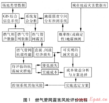 城市燃氣管網(wǎng)震害風險評價涉及到場地類別、地震強度、燃氣管網(wǎng)參數(shù)與抗震性能、抗震減災措施和GIS信息系統(tǒng)等方面,其典型流程見圖1[8]。
