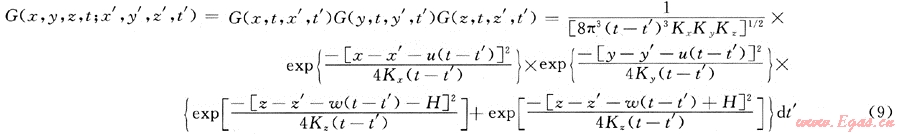 根據(jù)動(dòng)態(tài)泄漏率不定常的特點(diǎn),以氣體動(dòng)力學(xué)理論和湍流擴(kuò)散微分方程為基礎(chǔ),結(jié)合相應(yīng)的初始條件和邊界條件,利用格林函數(shù)進(jìn)行推導(dǎo),可得綜合擴(kuò)散模型格林函數(shù)為: