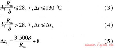 在計(jì)算極限狀態(tài)溫差時,若管道最大循環(huán)溫差不超過極限狀態(tài)溫差,錨固段的直管段不會發(fā)生局部屈曲。管道的極限狀態(tài)溫差和臨界徑厚比Rm/δ有關(guān),當(dāng)管徑確定,鋼管的壁厚越薄,越容易發(fā)生局部屈曲。最大循環(huán)溫差的極限狀態(tài)為: