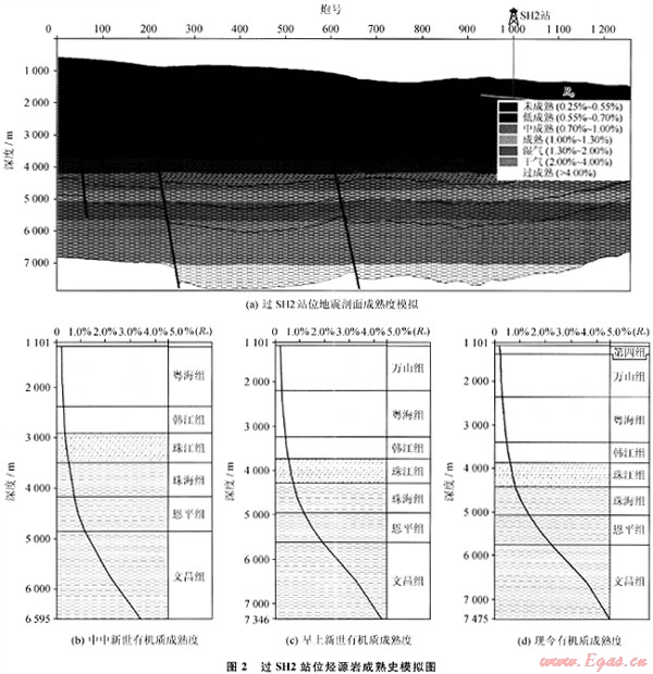 2007年4~6月,廣州海洋地質(zhì)調(diào)查局在神狐海域研究區(qū)內(nèi)實(shí)施了天然氣水合物鉆探,先后在3個站位成功鉆獲了天然氣水合物實(shí)物樣品,對其中的SH2站位沉積物樣品中的氣體進(jìn)行的氣相色譜分析的結(jié)果顯示[10]:CH4的體積分?jǐn)?shù)占96%~99%,C2H6和C3H8的體積分?jǐn)?shù)很低,干燥系數(shù)(C1/C2)一般在數(shù)百至1000以上,為典型的干氣。SH2站位含水合物層的總有機(jī)碳含量平均值為0.43%,已達(dá)到了作為生物氣烴源巖的標(biāo)準(zhǔn),對SH2站位進(jìn)行有機(jī)質(zhì)成熟度的熱演化模擬(圖1),結(jié)果表明:淺部地層珠江組、韓江組、粵海組和萬山組Ro值低于0.7%,多在0.2%~0.6%,處于未熟-低成熟的生烴門限附近,屬于良好的生物氣的烴源巖。這幾套層序厚度大,泥巖含量高,熱成熟低,有機(jī)質(zhì)豐度較高[11],其中,上中新統(tǒng)-第四系海相泥巖有機(jī)碳含量平均為0.22%~0.49%,且不同層位及層段均變化不大,第四系有機(jī)碳含量平均為0.22%~0.28%,上新統(tǒng)有機(jī)碳含量平均為0.30%~0.39%,上中新統(tǒng)有機(jī)碳含量平均為0.49%;上中新統(tǒng)-全新統(tǒng)海相泥巖生烴潛力(S1+S2)平均為0.13~0.32mg/g,與鶯歌海盆地大體一致。由此推測,該區(qū)具備生成生物氣的巨大潛力。
