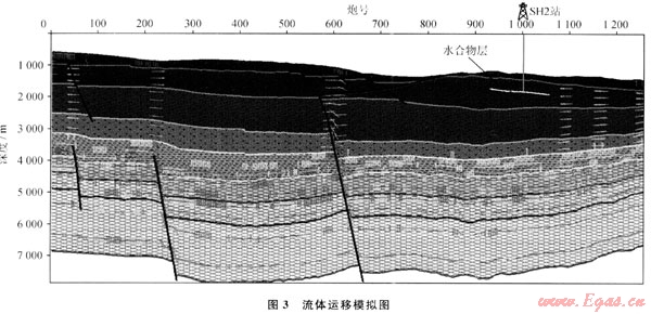 由于受區(qū)域構(gòu)造運(yùn)動,特別是新構(gòu)造運(yùn)動的作用,神狐研究區(qū)內(nèi)斷裂構(gòu)造發(fā)育。斷層可分為北東、北西和北北西向3組,且均為正斷層,其中北東向斷層有明顯切割北西向斷層的趨勢。斷層活動時間大致可分為晚中新世和上新世以來2個主要時期,晚中新世斷層以北西向?yàn)橹?,主要分布于研究區(qū)中北部,斷層大部分切割上中新統(tǒng),部分切穿上新統(tǒng),是研究區(qū)最主要斷層活動時期;上新世以來活動斷層以北東向?yàn)橹鳎瑪鄬踊顒訌?qiáng)度小,但數(shù)量眾多。由于這些斷層貫通了下部氣源巖系與上部水合物形成的溫壓穩(wěn)定帶層系,改善了天然氣的垂向運(yùn)移條件,而斷層活動時間又橫跨生氣和排氣高峰期,成為構(gòu)成流體運(yùn)移的一個主要通道。同時,應(yīng)該注意到如果斷層過大,直通海底,會造成部分氣體的散失。從過SH2站位地震剖面流體運(yùn)移模擬結(jié)果來看(圖3),由于該處發(fā)育斷裂,直通海底,導(dǎo)致深部熱解氣源部分通過斷裂直通海底散失,未能有效運(yùn)移至水合物穩(wěn)定域,所以鉆井處熱解氣源對水合物貢獻(xiàn)較小。同時從圖中烴氣運(yùn)移方向分析,該處鉆遇的水合物主要為淺層生物成因氣通過橫向運(yùn)移至水合物穩(wěn)定域形成。