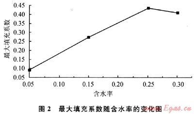 其得到的結(jié)果顯示在含水率小于30%時,可以用最大填充系數(shù)值Φmax為0.57來計算,并且計算的結(jié)果與實驗的測量值很吻合。本實驗所使用的柴油黏度為5.12mPa·s,試圖運用Pauchard的方法來尋求一個適當(dāng)?shù)?Phi;max值進行漿液黏度的預(yù)測,因此,反算出了在不同含水率下的Φmax值,如圖2所示。計算結(jié)果顯示含水率分別為25%和30%時的最大填充系數(shù)分別為0.436和0.414;而當(dāng)含水率分別為5%和15%時的最大填充系數(shù)分別為0.093和0.275。本結(jié)果與文獻中的差異可能是由于所選用的實驗介質(zhì)和環(huán)境不同等綜合因素引起的。從圖2中還可以發(fā)現(xiàn):在含水率小于25%時最大填充系數(shù)隨著含水率的增加而增加,幾乎呈線性關(guān)系,以此擬合出填充系數(shù)與含水率的關(guān)系: