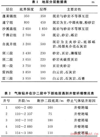 九龍山構(gòu)造區(qū)域?qū)儆诖ū臂晗輲е袎?、九龍山北東向構(gòu)造群,米倉山山前帶南部。西北緊鄰龍門山推覆構(gòu)造帶,北部為米倉山臺緣隆起,東南與川中隆起帶相鄰。地層分層數(shù)據(jù)見表1。地層分層的數(shù)據(jù)表明,在于佛巖組與自流井組存在堅硬的礫巖層,其礫巖成分有石英、燧石和黃鐵礦等,研磨性強(qiáng),可鉆性極差,將導(dǎo)致機(jī)械鉆速急劇降低,以龍17井為例,在千佛巖組2932~3036m井段,進(jìn)尺共104m,消耗鉆頭11只,平均單只鉆頭進(jìn)尺僅為9.5m,平均機(jī)械鉆速為0.85m/h。多個區(qū)塊的鉆井實踐表明[3~6],與其他鉆井技術(shù)相比,氣體鉆井的提速效果異常明顯。因此,九龍山構(gòu)造開發(fā)前期,在沙溪廟組廣泛開展氣體鉆井技術(shù),但是氣體鉆井雖然機(jī)械鉆速加快,但多口井卻出現(xiàn)井壁坍塌,使井況更加復(fù)雜(表2),且由氣體鉆井轉(zhuǎn)換為常規(guī)鉆井后,下部地層的機(jī)械鉆速降低明顯。若要在下部地層繼續(xù)安全快速鉆進(jìn),液體欠平衡鉆井可作為一種重要手段。