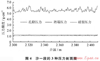 要在九龍山構(gòu)造安全開展欠平衡鉆井,前提是必須滿足井壁穩(wěn)定條件。測井資料表明,沙一段至珍珠沖組井段多含有泥巖段。因此,有必要采用泥頁巖水化模型分析坍塌壓力剖面。為此,本文利用測井資料,采用加拿大STAB-WELL欠平衡鉆井井壁穩(wěn)定分析軟件對不同層位進(jìn)行井壁穩(wěn)定計算。圖4是沙一段的3種壓力剖面。從圖4中可以看出,該段破裂壓力高,孔隙壓力梯度為1.254g/cm3,最高坍塌壓力梯度為1.094g/cm3,欠平衡設(shè)計的鉆井液密度必須要高于最低坍塌壓力梯度,設(shè)計的范圍為1.10~1.25g/cm3。圖5是千佛巖組層段的3種壓力剖面,計算結(jié)果表明,該段最高坍塌壓力梯度為1.10g/cm3,欠平衡設(shè)計的鉆井液密度必須高于最低坍塌壓力梯度,設(shè)計的范圍為1.10~1.25g/cm3。