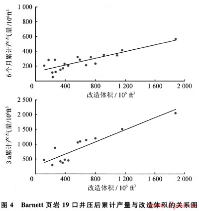 在Barnett頁巖19口有井下微地震監(jiān)測資料的井,改造后的體積與壓后6個月和3a累計(jì)產(chǎn)量的比較曲線見圖4。由圖4可見:19口井的壓裂改造體積在5.3×106~52.7×106m3,且壓后4個月的累計(jì)產(chǎn)量隨著改造體積的增加而增加,壓后3a增加的幅度更大,這充分說明改造體積對頁巖氣壓后產(chǎn)量的重要作用。