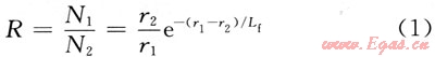 式中N1、N2分別為近探測(cè)器和遠(yuǎn)探測(cè)器的熱中子或俘獲伽馬計(jì)數(shù)率;r1、r2分別為短源距和長源距;Lf為地層的快中子減速長度。