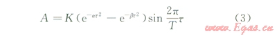式中A為子波的瞬時(t)振幅,K為單元子波的振幅倍數(shù),對于反射子波,如果入射子波為一個單元子波,那么K就是反射系數(shù),這時K是一個分數(shù),T是振蕩的主周期,(e-at2-e-bt2)為子波包絡(luò),其中t是從包絡(luò)起點t0開始計算的時間,t0可以是從激發(fā)開始計算的時間,也就是記錄上的波至?xí)r間,子波包絡(luò)還可以寫成: