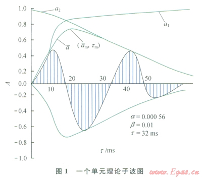 從圖l上可以看出,子波包絡(luò)在時間tm上有極大值`am(頂桿表示絕對值),將包絡(luò)曲線分成前部上升和后部下降的兩個半枝。對后半枝而言,當(dāng)t稍大于tm時,包含b值的e-gt2一項很快接近于零[式(4)],這時`A≈Ke-at2。