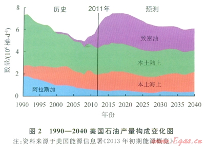 當(dāng)人們還在深入探討頁巖氣革命對美國能源獨(dú)立,以及對地緣油氣、經(jīng)濟(jì)和政治的影響時(shí),美國原油的產(chǎn)量上升卻更令人驚詫。但在有關(guān)文獻(xiàn)上都強(qiáng)調(diào),在傳統(tǒng)常規(guī)石油(包括陸上、海上和阿拉斯加)產(chǎn)量總體上下降的背景上,使美國改變了數(shù)十年石油產(chǎn)量降勢[5]的因素是致密油產(chǎn)量的快速增加(圖2)。在這類文獻(xiàn)中所指的致密油實(shí)際上包括了頁巖油和致密砂巖油[6],顯然使用的是筆者在本文開始時(shí)就指出的廣義的致密油氣概念。在有關(guān)文獻(xiàn)的文圖中一提到具體的產(chǎn)地和產(chǎn)層,就顯示它們大部分都位于研究者熟知的頁巖氣產(chǎn)區(qū)和層系內(nèi)。實(shí)際上,即使在本世紀(jì)初伴隨頁巖氣增產(chǎn),以凝析油為主的頁巖油產(chǎn)量就已經(jīng)在不斷增加著(如2004年日產(chǎn)11.1×l04桶,l桶=l58.9L,下同),這就促使美國的石油產(chǎn)量從2006年日產(chǎn)684.1×104桶的最低點(diǎn)開始了具歷史性意義的轉(zhuǎn)降為升,2007年僅增產(chǎn)0.9%,而2008和2009年的平均年增率為2.3%。在美國開始更加重視頁巖油的2009年,所統(tǒng)計(jì)的致密油的日產(chǎn)量就達(dá)25×104桶;到2011年為日產(chǎn)90×104桶,增加了2.6倍,從而使這兩年美國石油產(chǎn)量年增率達(dá)4.6%,該年致密油產(chǎn)量占全美石油總產(chǎn)量的ll.5%。顯然,美國致密油產(chǎn)量和石油總產(chǎn)量都呈加速增長之勢。由于產(chǎn)量基數(shù)大,使得近年來美國石油年增加量居世界之首。按照EIA的初步統(tǒng)計(jì),2012年上半年致密油產(chǎn)量同比增加9.7%?!?span lang="EN-US">BP2013年度全球能源展望》進(jìn)一步表明:美國2012年原油總產(chǎn)量達(dá)3.949×108t,增長49.2×l06t,年增率達(dá)l4.2%。“大部分新增產(chǎn)量來自頁巖資源”。全球按石油年增率排序列在美國后4位的伊拉克、科威特、加拿大、卡塔爾依次為ll.5%、9.2%、7.2%、6.5%;總產(chǎn)量居世界前兩名的沙特阿拉伯和俄羅斯年增率分別僅為3.91%、l.5%;美國2012年石油增產(chǎn)量占全球增產(chǎn)量的49.2%[3]。據(jù)EIA預(yù)測,2020年美國致密油日產(chǎn)量可達(dá)300×104桶,可占全美石油總產(chǎn)量的36%;進(jìn)而推測2017年后美國石油產(chǎn)量將有超過沙特阿拉伯的可能。直接受惠于美國的技術(shù)和管理,加拿大2011年致密油日產(chǎn)量為l9×104桶,約占其石油總產(chǎn)量的5.4%;預(yù)測2035年加拿大原油日產(chǎn)量可達(dá)50×104桶。EIA還預(yù)測,2020年中國頁巖油日產(chǎn)量將可能超過20×104桶,阿根廷的內(nèi)烏達(dá)盆地頁巖油日產(chǎn)量可達(dá)15×104桶[7]。