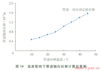 由計算結(jié)果可知,相對于管道一端有固定墩約束,管道兩端有固定墩約束時產(chǎn)生的應(yīng)力較大。在內(nèi)外壁溫差較小時,隨著輸氣溫度的增加,管道一端有固定墩時產(chǎn)生的熱應(yīng)力趨于水平,由此可知溫度對管道應(yīng)力影響較小,這是因為軸向伸長得到補償從而減小了管道產(chǎn)生的集中應(yīng)力。在內(nèi)外壁溫差保持不變時,管道應(yīng)力不發(fā)生較大變化。在內(nèi)外壁溫差較小時,管道兩端有固定墩約束情況下管道最大應(yīng)力隨輸氣溫度的增加而明顯增加,遠大于管道一端有固定墩約束時產(chǎn)生的應(yīng)力。管道內(nèi)輸氣壓力的增加造成管道應(yīng)力增加。在溫度影響下管道一端有固定墩約束時軸向位移計算結(jié)果如圖l0所示。
