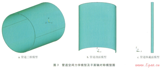 根據(jù)彈性力學和有限元理論,管道熱應(yīng)力和外擠載荷的空間問題可以應(yīng)用平面應(yīng)力及軸對稱建立平面有限元模型,計算分析管道的應(yīng)力分布及大小如圖3所不。圖3-a為1219mm外徑X80管道空間力學模型;圖3-b為X80管道三維剖面,以2軸為對稱軸;圖3-c為管道縱軸旋轉(zhuǎn)截面,以z軸為對稱軸旋轉(zhuǎn)。